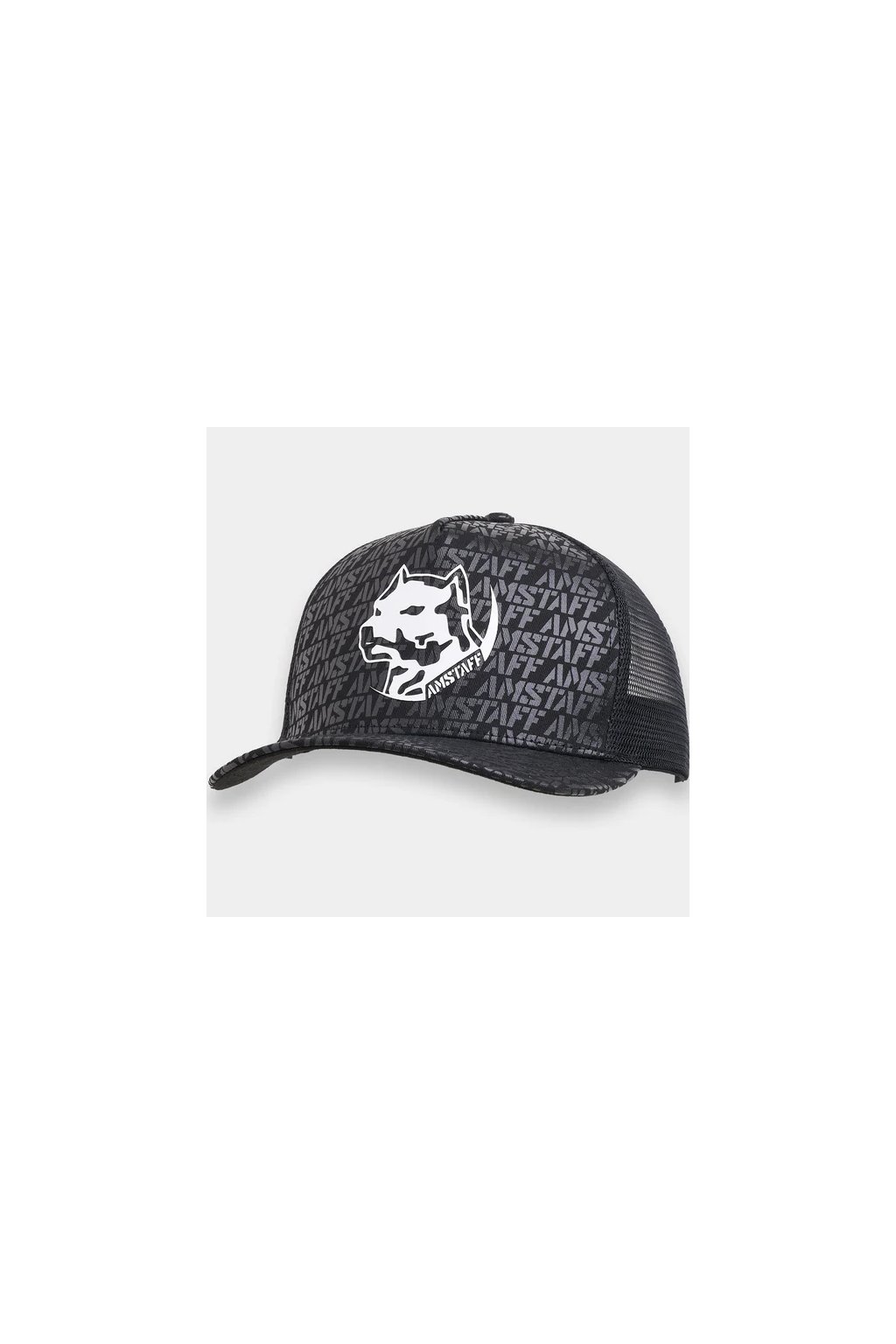 Stylová kšiltovka s celoplošným potiskem AMSTAFF. Velký, kontrastní potisk loga psa na přední straně. Černý síťovaný materiál pro optimální ventilaci. Mírně zakřivený kšilt v retro stylu. Značkové výztuhy na vnitřní straně. Nastavitelné zapínání na patentky v bílé barvě. Materiál: 60 % bavlna, 40 % polyester.
