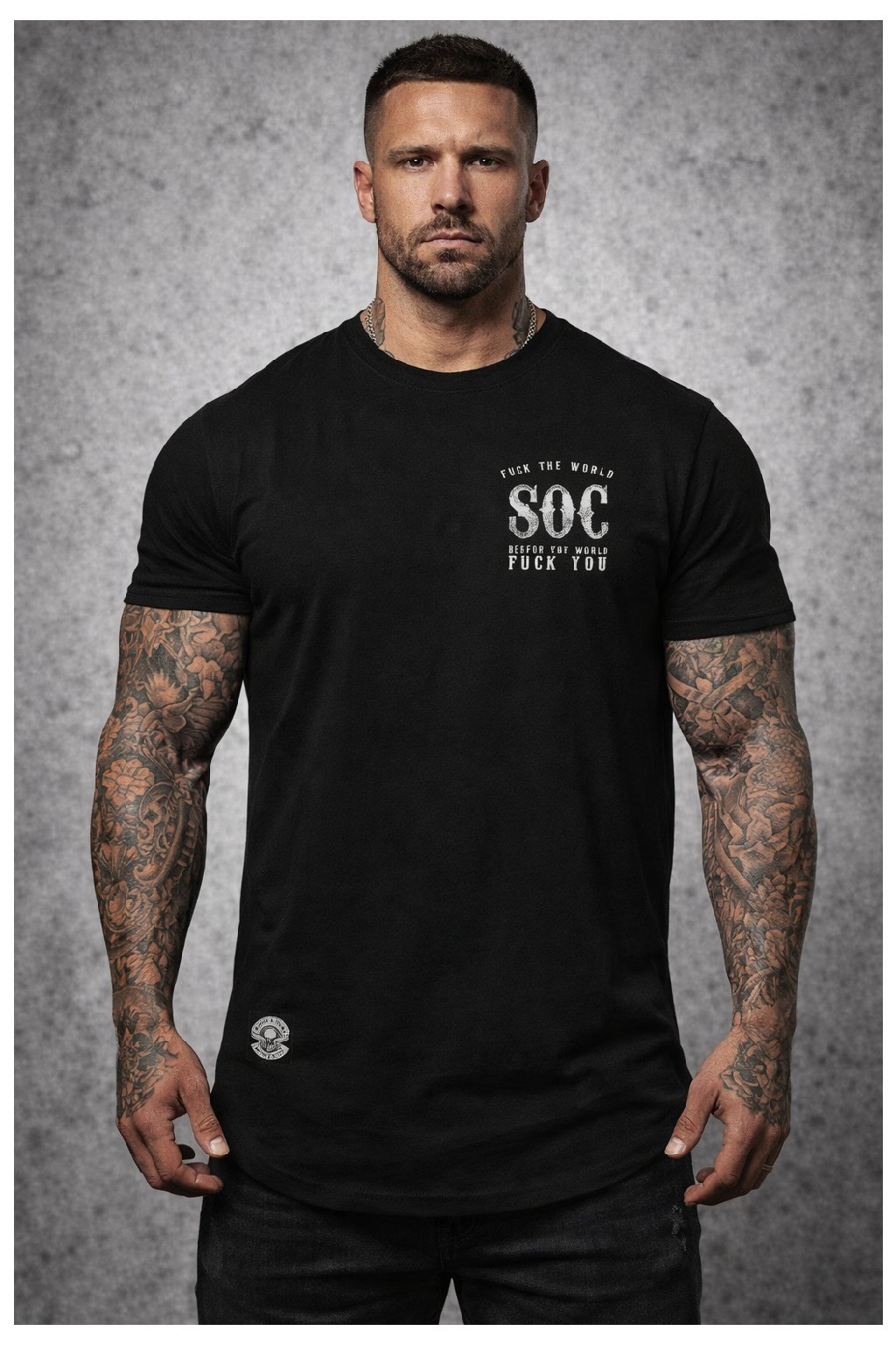 Jste připraveni něco říct? Naše tričko „Sons of Crime“ není pro slabé povahy. Výrazný přední potisk s nápisem SOC okamžitě ukazuje, za čím si stojíte: postoj, houževnatost, loajalita. Na zadní straně agresivní klaunský design se zkříženými zbraněmi a nezaměnitelný slogan „FUCK THE WORLD - BEFORE THE WORLD FUCK YOU“ zajistí maximální pozornost.