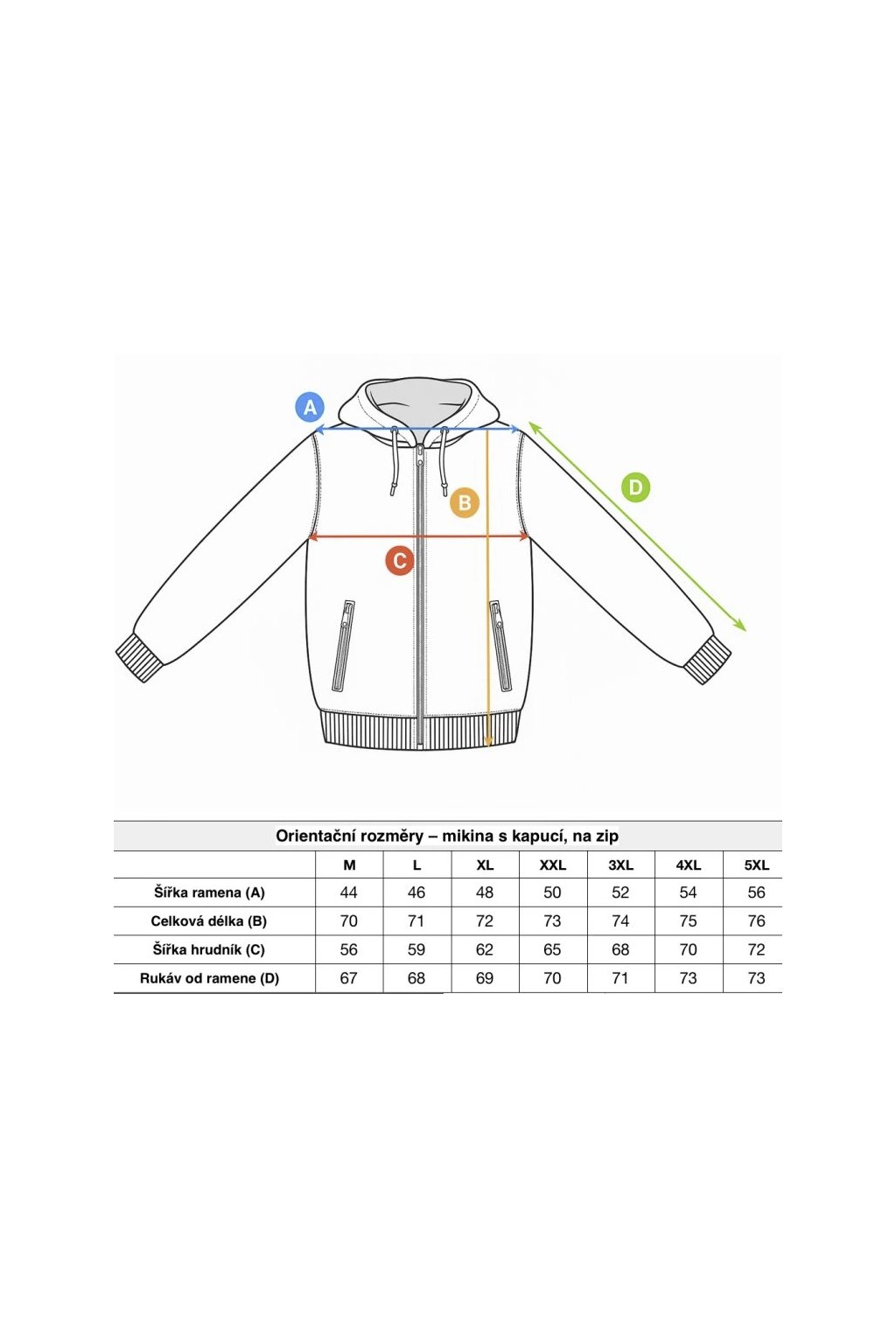 Orientační rozměry – mikina s kapucí, na zip |