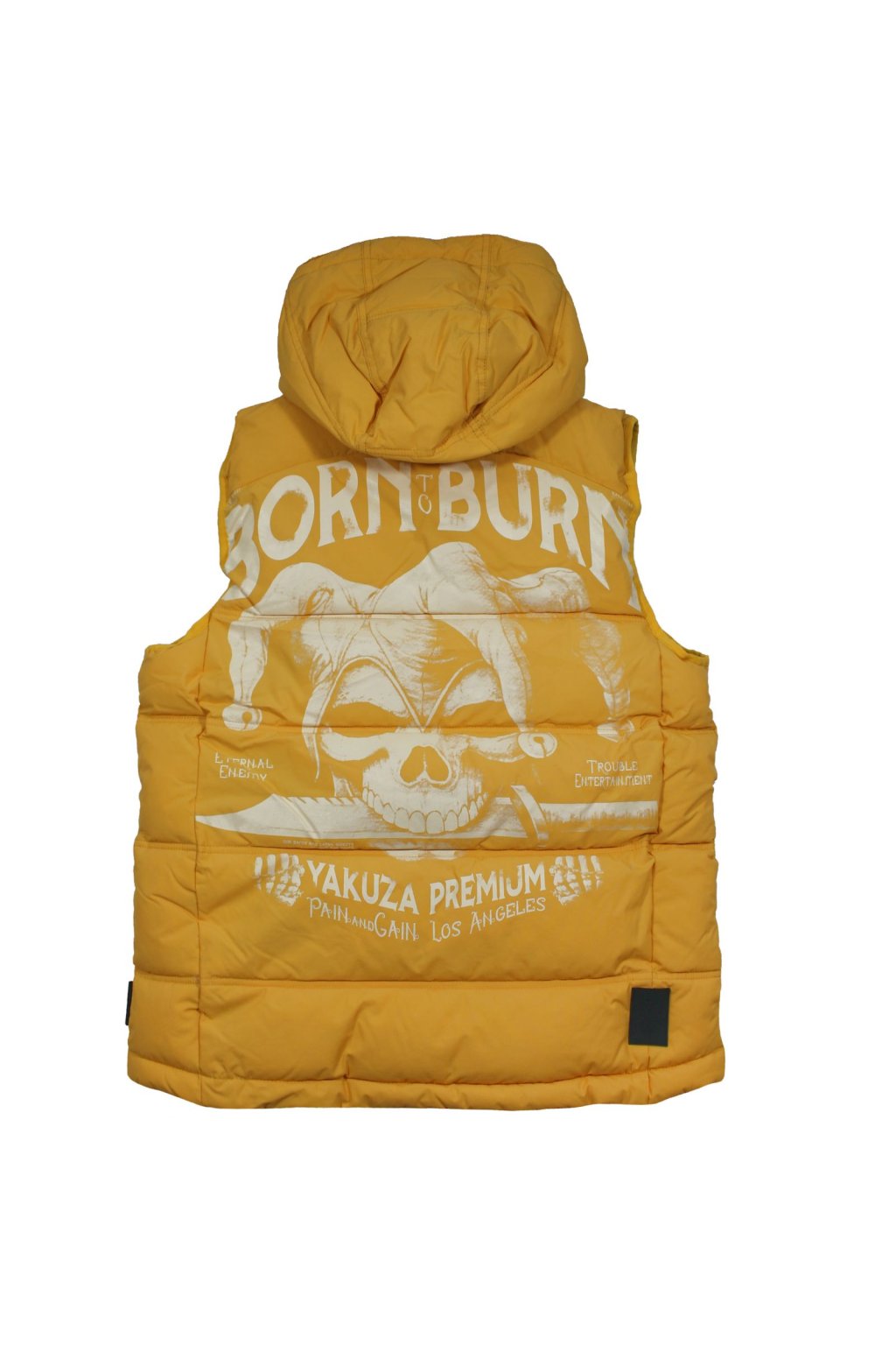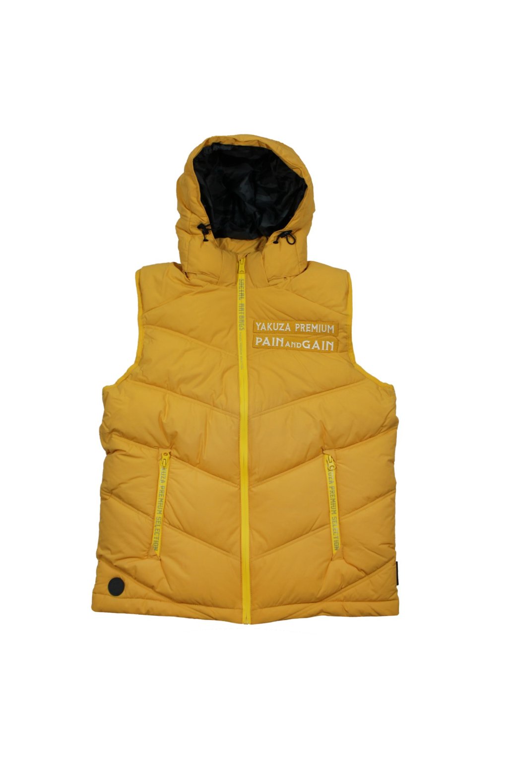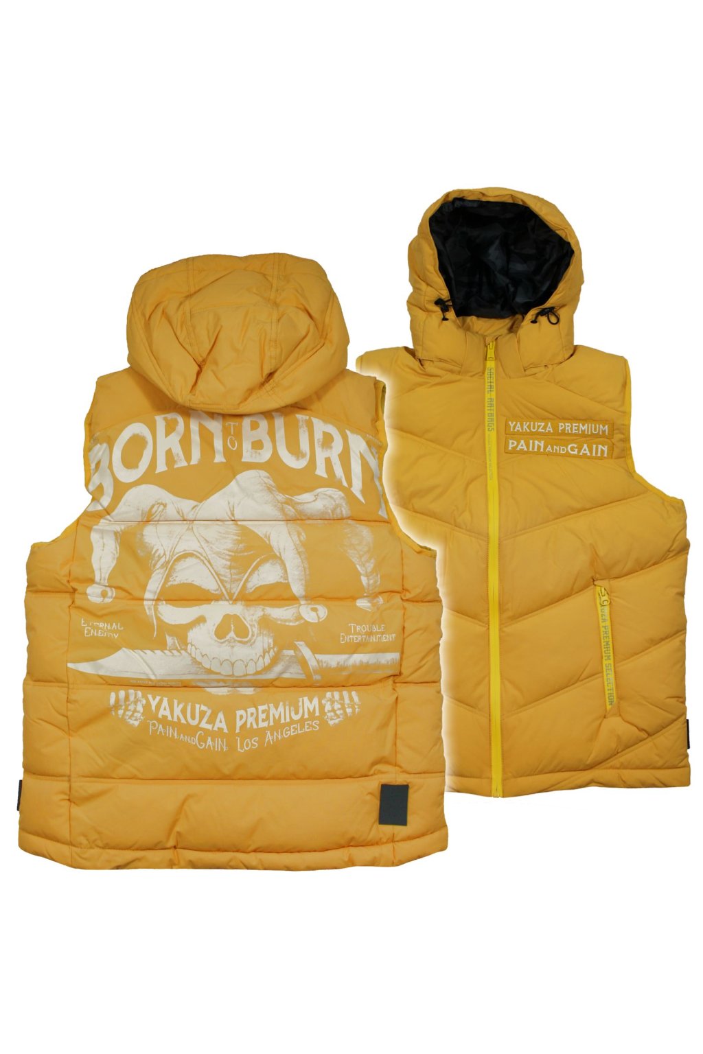 Limitovaná edice vesty 3966 ve žluté barvě od Yakuza Premium pro muže. Tato prošívaná vesta vás nejen zahřeje, ale také vypadá neuvěřitelně stylově. Má odnímatelnou kapuci, dvojitou nášivku na levé straně hrudi a dvě přední kapsy. Na zadní straně je velký potisk s harlekýnem. Tuto prošívanou vestu dělají výjimečnou potištěné zipy. Vesta má poměrně volný střih a odpovídá velikosti.